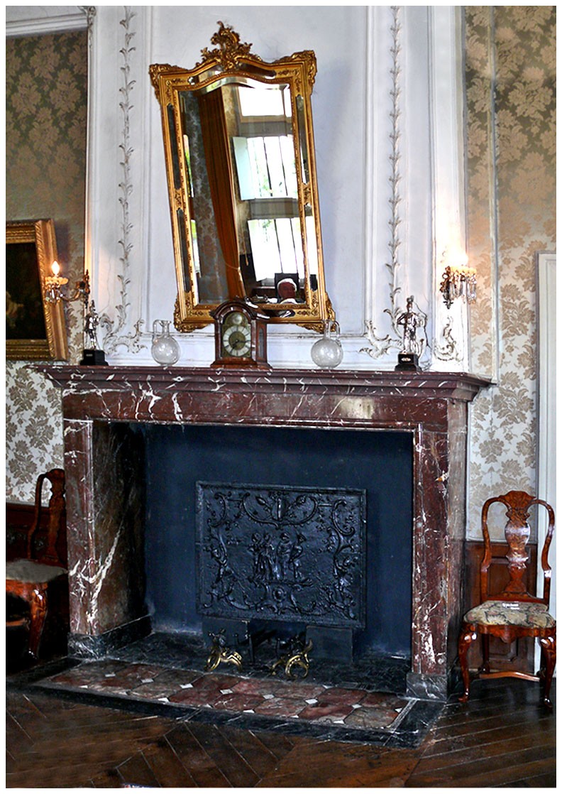 Sur la cheminée Louis XIV est posée une pendule en noyer Queen Anne (XVIIIème siècle).