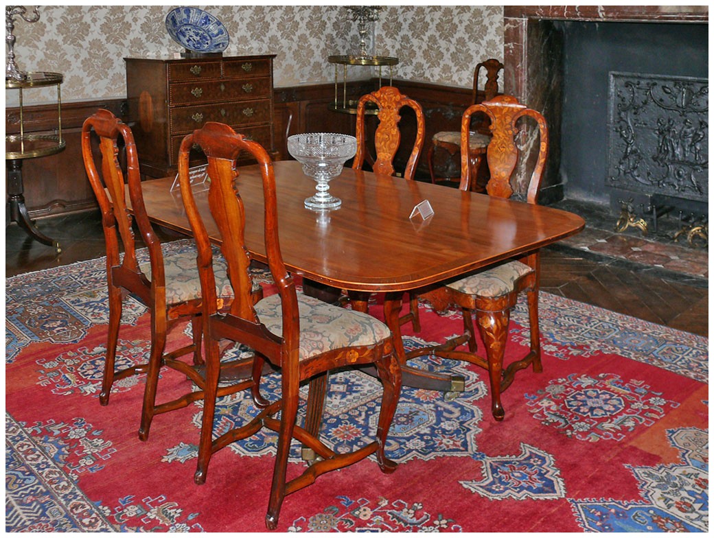 Table et chaises.Remarquez les dessertes de chaque côté de la commode.
