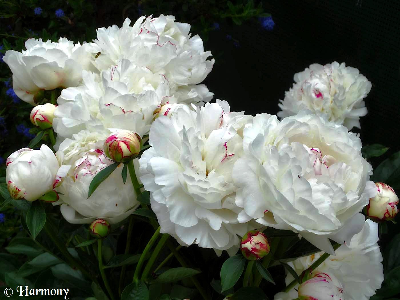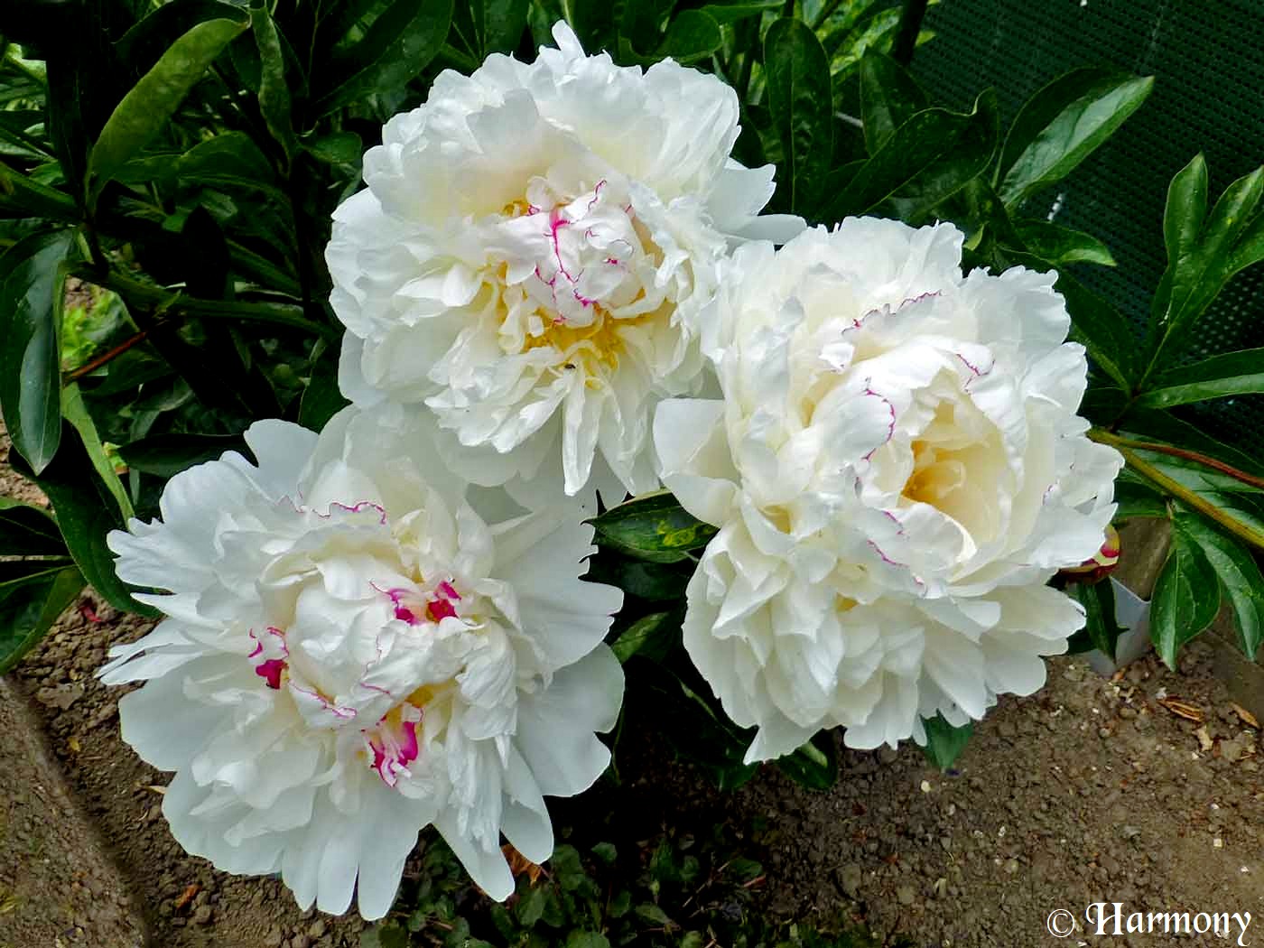 Paeonia ‘Festiva maxima’ est une très belle variété de pivoine de Chine, c’est une vivace herbacée à fleurs doubles blanches et parfumées. De bonne tenue dans les massifs, elle est également parfaite pour la confection de bouquets.La floraison délicate et abondantede cette pivoine se compose de fleurs très doubles apparaissant entre mai et juin qui ne mesurent pas moins de 16cm de diamètre, blanc pur maculées d’un fin liseré rouge carmin et légèrement parfumées.En fleurs pendant presque 1 mois, la Pivoine ‘Festiva Maxima’ forme un buisson d’un mètre de hauteur, le feuillage est vert franc abondant.