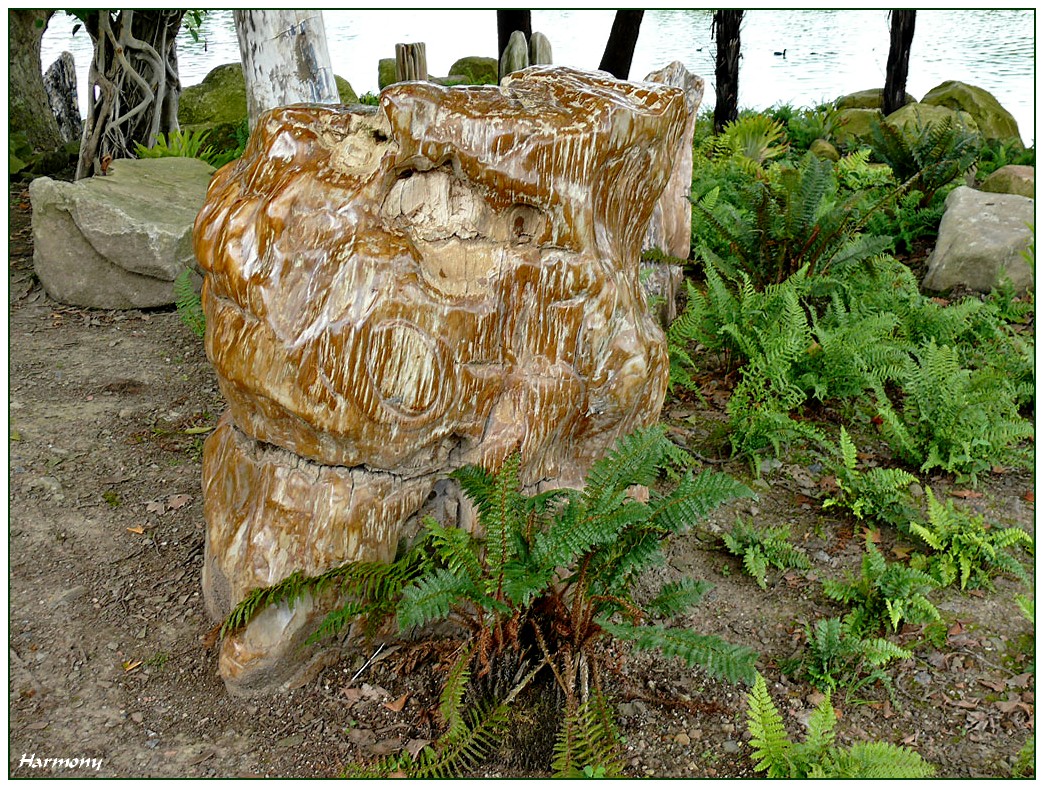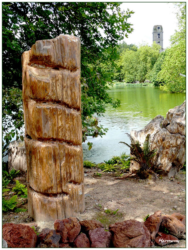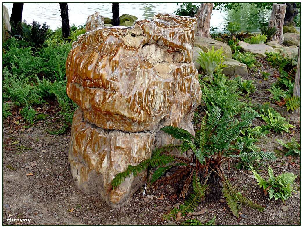 entourés d’une forêt de troncs d’arbre fossilisés,